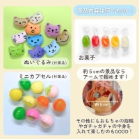 景品はぬいぐるみとカプセルが付属しますが、お菓子やご自宅のおもちゃなど、アームで掴めるサイズの約5cmまでの大きさのものなら好きなものを入れられます。